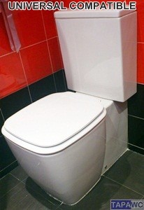 * La foto del asiento del wc corresponde al modelo tapawc original, el modelo TAPAWC COMPATIBLE adapta pero no es idéntico al original. El modelo compatible no es envolvente, esto es cerrada la tapa se ve el perfil tanto del aro como de la tapa, el herraje queda a la vista y la tapa es lisa (Pinchar sobre foto detalle tapawc compatible o ver pregunta 6 en FAQS en apartado AYUDA).